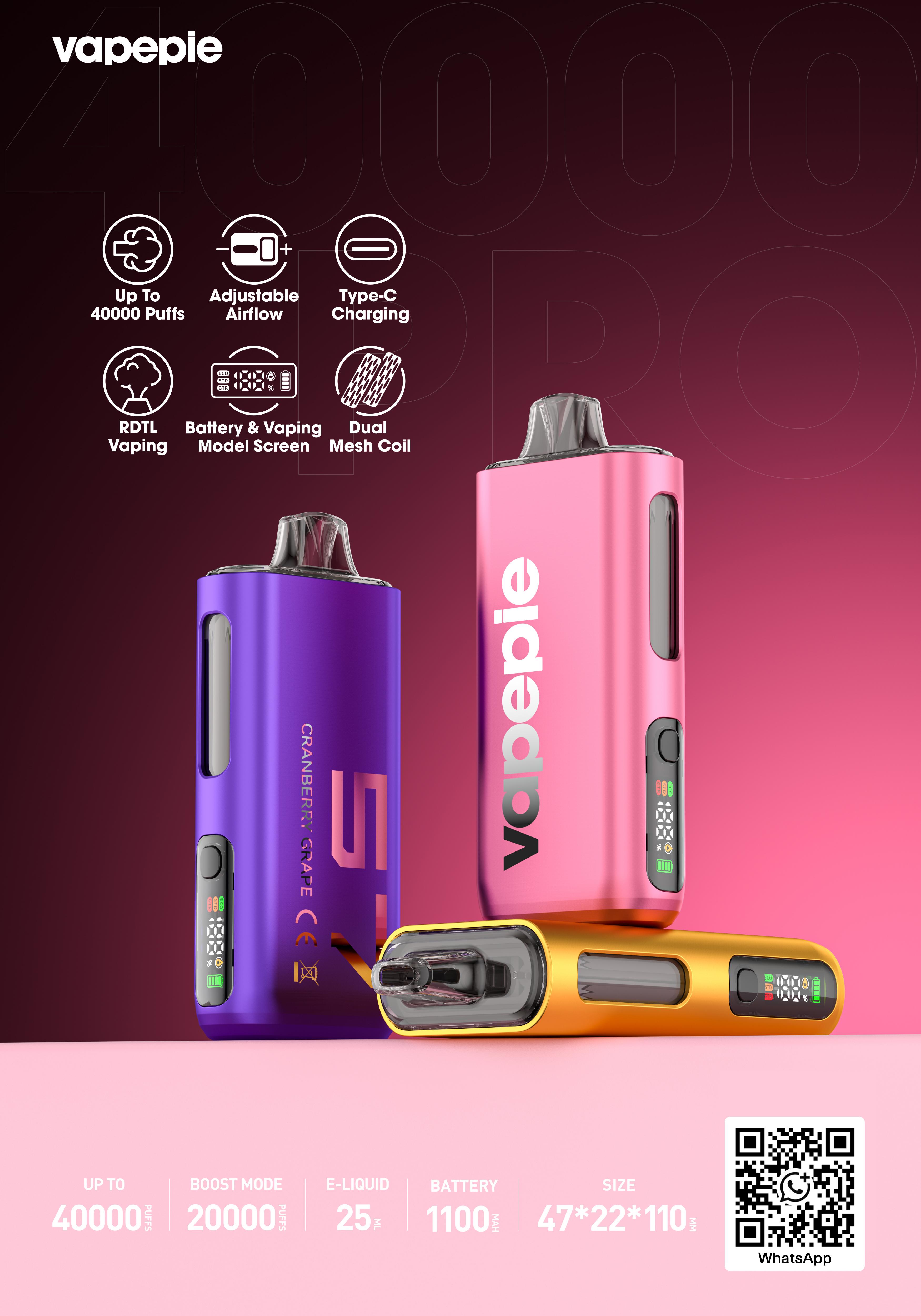 VAPEPIE MAX 40000: Akár 40000 szívás, Beállítható Levegőáramlás, RDTL Vaping, Látható Folyadékablak, Dupla Mesh Coil, Kijelző